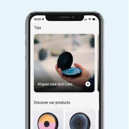 インビザライン® アライナーバッグに印刷されている二次元コードを読み取っていただくと、My Invisalign アプリのダウンロードページが開きます。クリニックで患者様に最初のアライナーをお渡しする際、実際にこの二次元コードを患者様のスマートフォンで読み取って、アプリをダウンロードするようご案内ください。My Invisalign アプリのアカウント作成のステップで再度アライナーバッグを撮影すると患者情報が自動的に入力されます